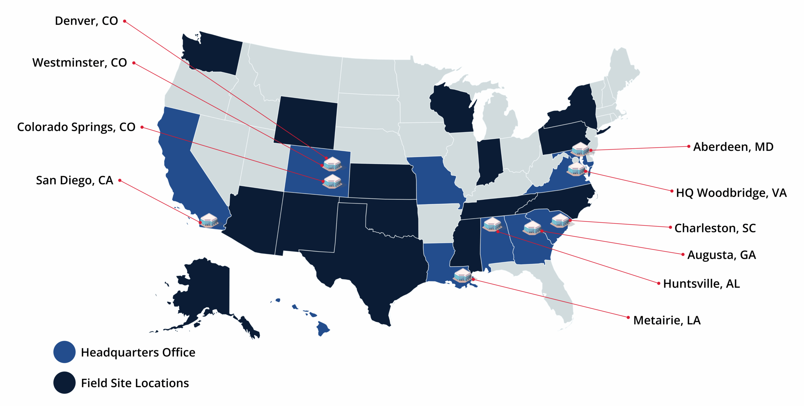 Sev1Tech maintains field and project sites in more than 20 CONUS states as well as OCONUS locations, including Alaska, Hawaii, Korea, United Kingdom, Greenland, Germany, Kuwait, Iraq, Bahrain, and Qatar